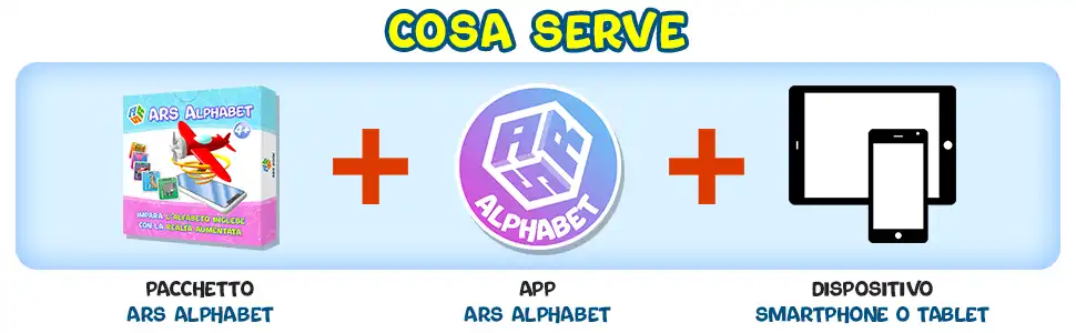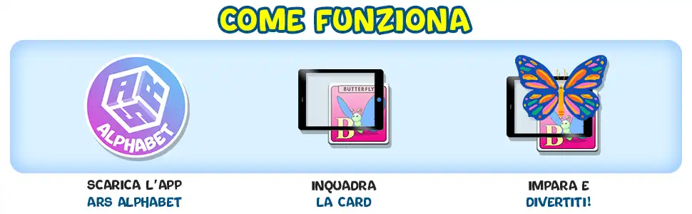 ARS Alphabet è un set di 26 carte illustrate progettato per bambini dai 4 ai 9 anni. Ogni carta rappresenta una lettera dell'alfabeto inglese associata a un oggetto o animale, che prende vita grazie all'app in Realtà Aumentata.